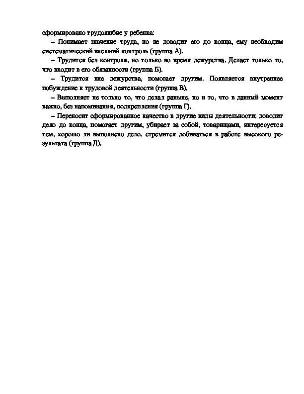 Подсчитывают количество детей в каждой группе. Определяют, насколькосформировано трудолюбие у ребенка: