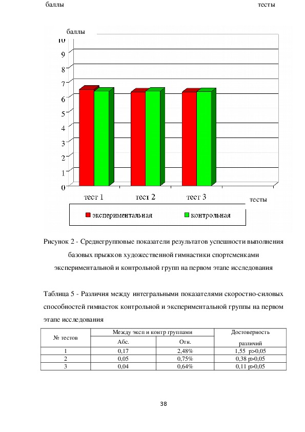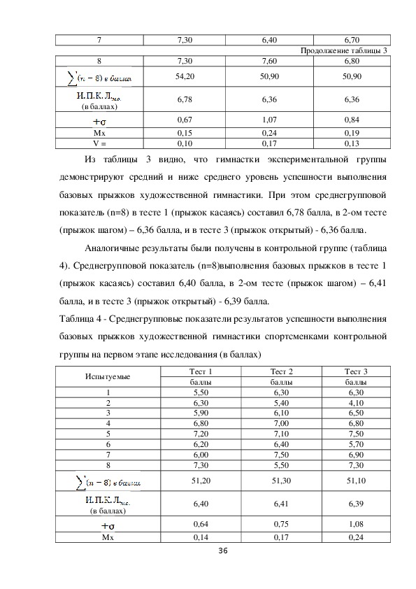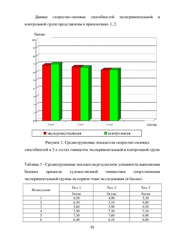 выполнения базовых прыжков гимнастками контрольных групп на первом и