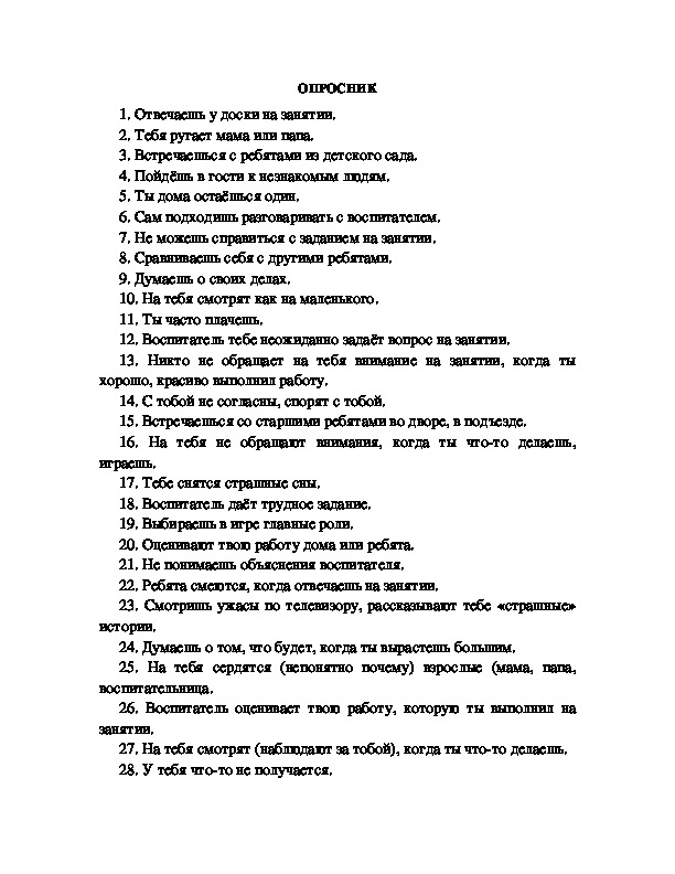 28. У тебя чтото не получается.29. Ребята с тобой не играют (не берут никогда в игру), не дружат с