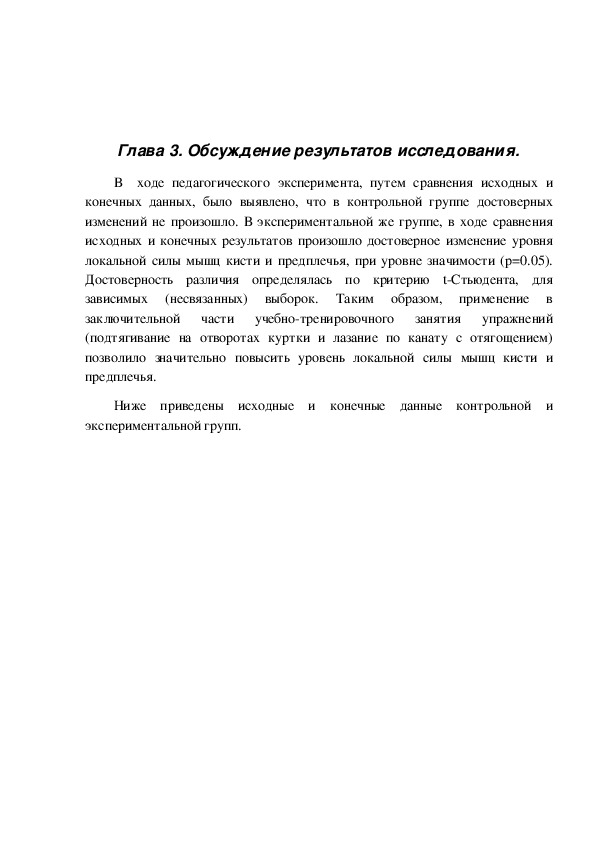 Контрольная группа тренировалась по общепринятой методике.Глава 3. Обсуждение результатов исследования.