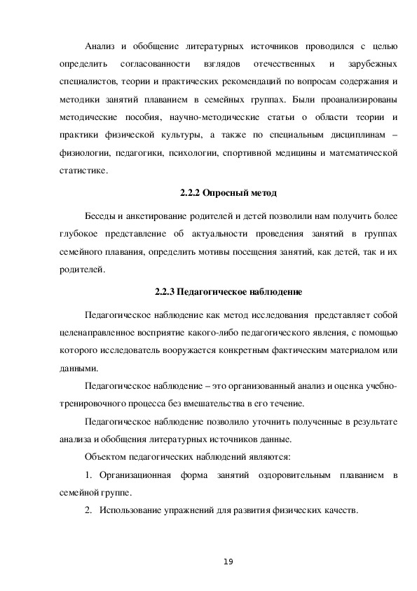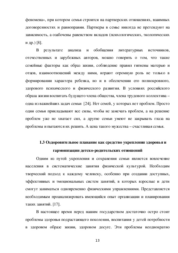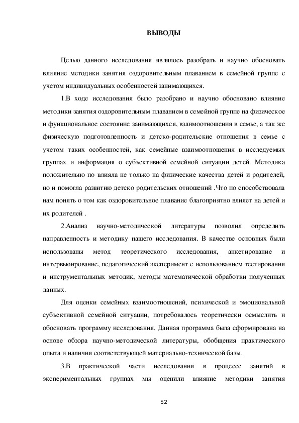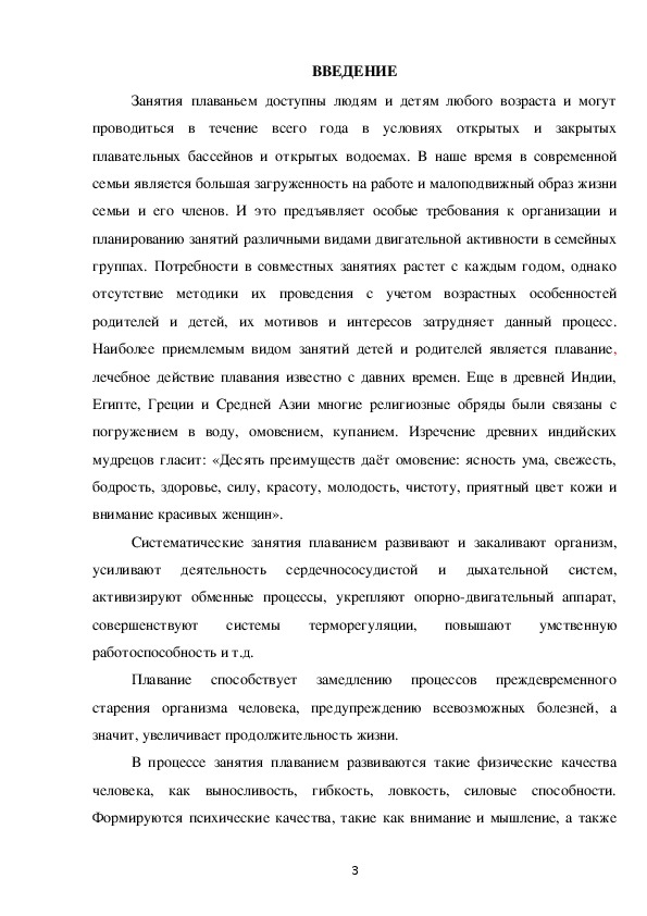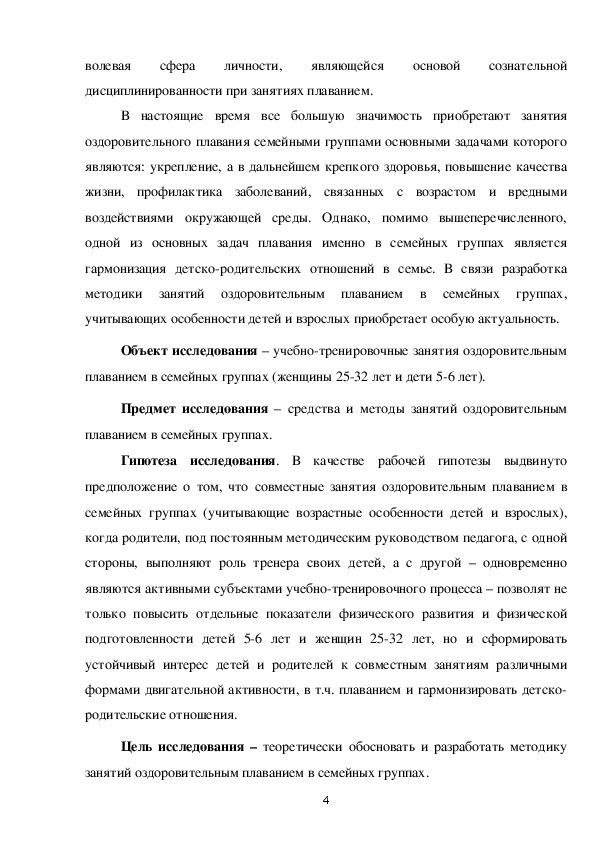 В настоящие время все большую значимость приобретают занятия оздоровительного плавания семейными группами основными задачами которого являются: укрепление, а в дальнейшем крепкого здоровья, повышение качества жизни, профилактика заболеваний, связанных с возрастом и вредными воздействиями окружающей среды. Однако, помимо вышеперечисленного, одной из основных задач плавания именно в семейных группах является гармонизация детско-родительских отношений в семье. В связи разработка методики занятий оздоровительным плаванием в семейных группах, учитывающих особенности детей и взрослых приобретает особую актуальность.