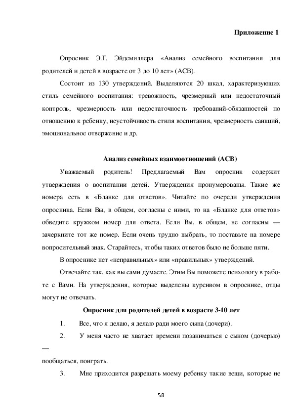 родителей и детей в возрасте от 3 до 10 лет» (АСВ). Состоит из 130