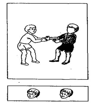 Инструкция. «Сейчас ты будешь придумывать рассказы по картинкам. Посмотри, все — и взрослые, и дети — нарисованы без лиц (предъявляется картинка 1). Это сделано специально, для того чтобы интереснее было придумывать. Я буду показывать тебе картинки, их всего двенадцать, а ты должен придумать, какое у мальчика (девочки) на каждой картинке настроение и почему у него такое настроение. Ты знаешь, что настроение отражается у нас на лице. Когда у нас хорошее настроение, лицо у нас веселое, радостное, счастливое, а когда плохое — грустное, печальное. Я покажу тебе картинку, а ты мне расскажешь, какое у мальчика (девочки) лицо — веселое, грустное или какое-нибудь еще, и объяснишь, почему у него или нее такое лицо».