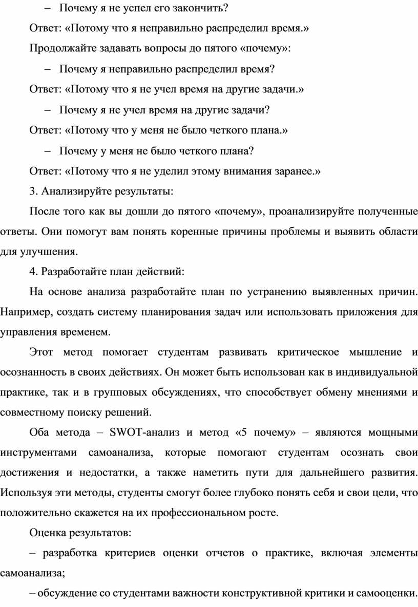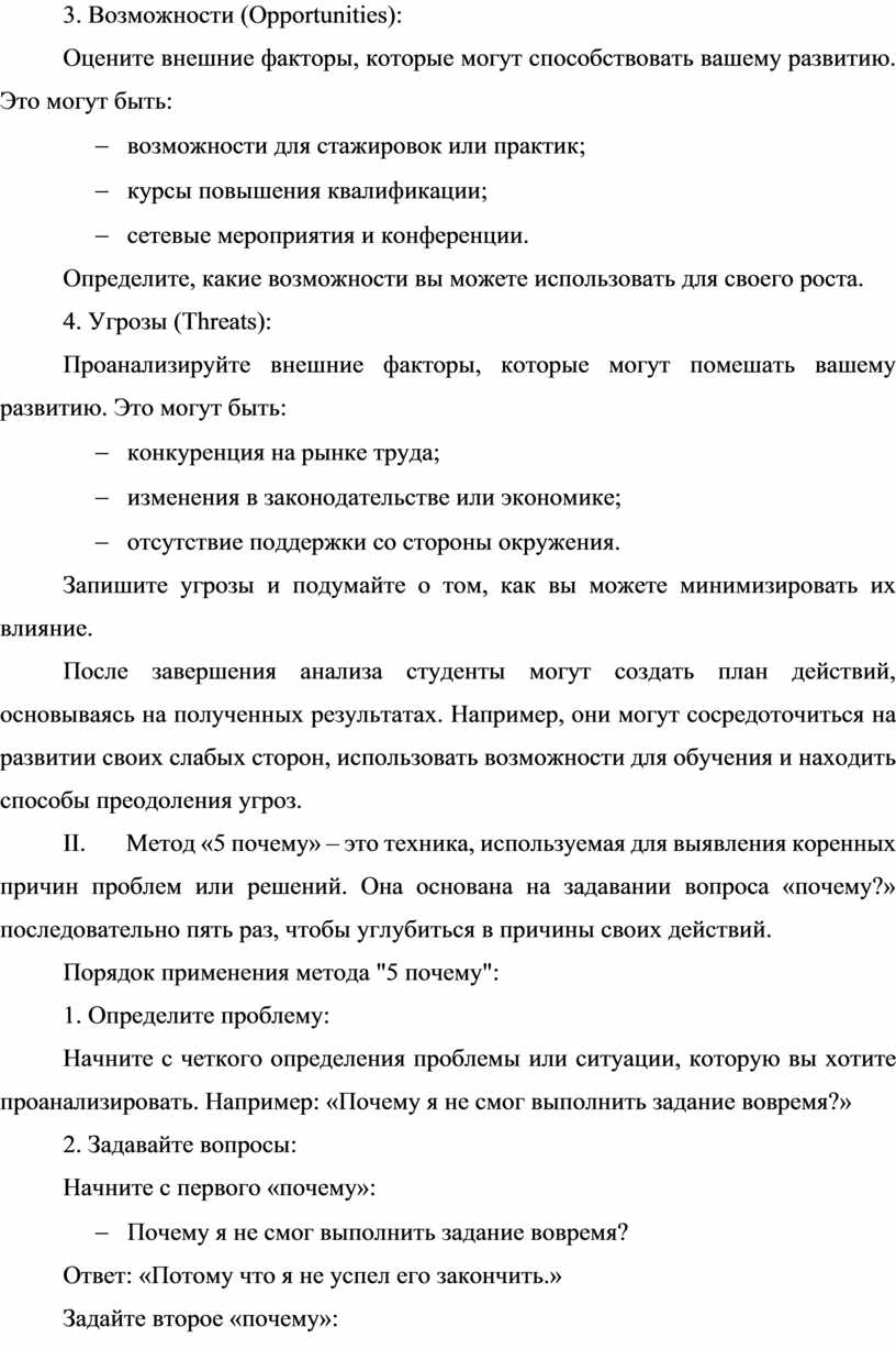 Оба метода – SWOT-анализ и метод «5 почему» – являются мощными инструментами самоанализа, которые помогают студентам осознать свои достижения и недостатки, а также наметить пути для дальнейшего развития. Используя эти методы, студенты смогут более глубоко понять себя и свои цели, что положительно скажется на их профессиональном росте.