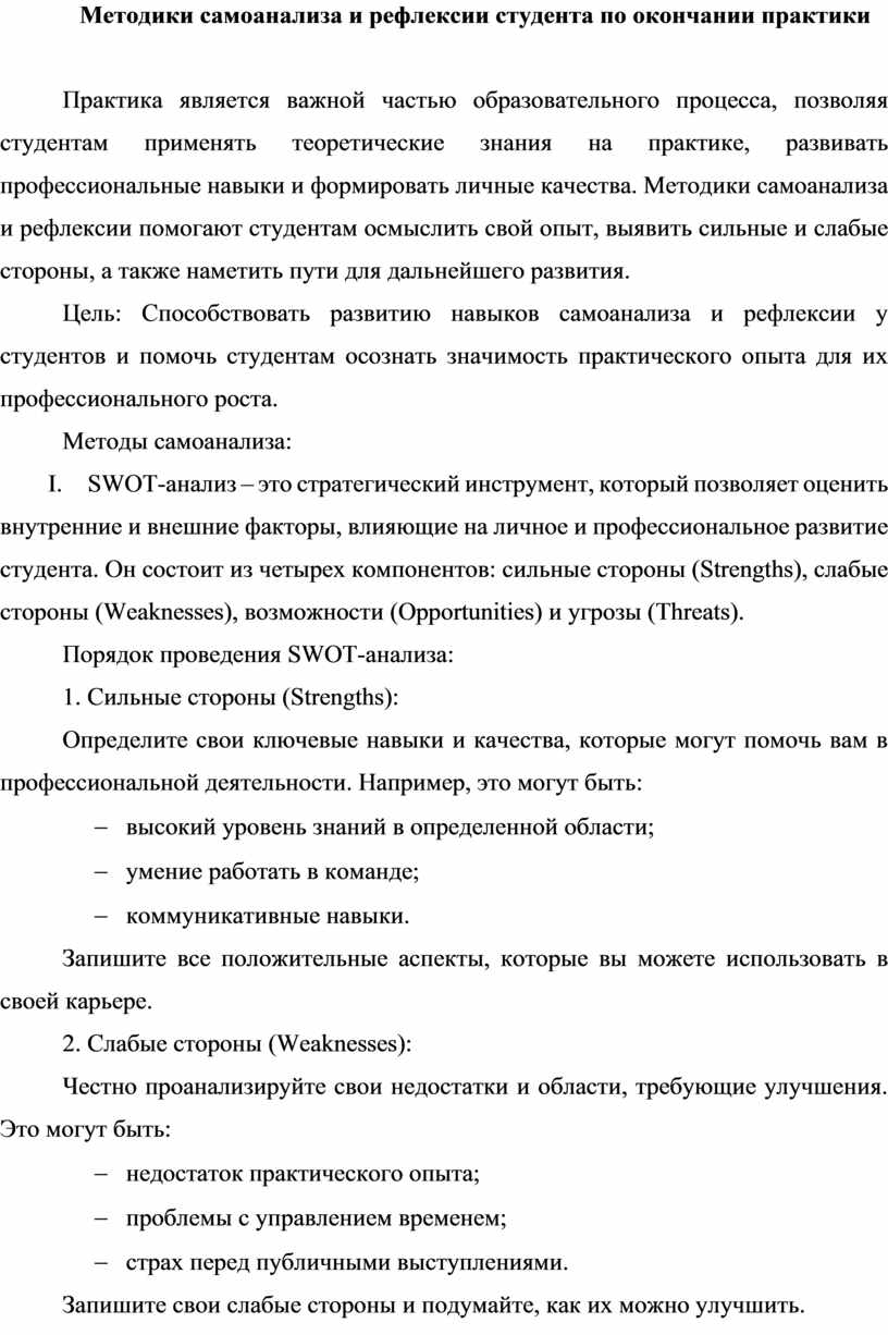 Практика является важной частью образовательного процесса, позволяя студентам применять теоретические знания на практике, развивать профессиональные навыки и формировать личные качества. Методики самоанализа и рефлексии помогают студентам осмыслить свой опыт, выявить сильные и слабые стороны, а также наметить пути для дальнейшего развития.