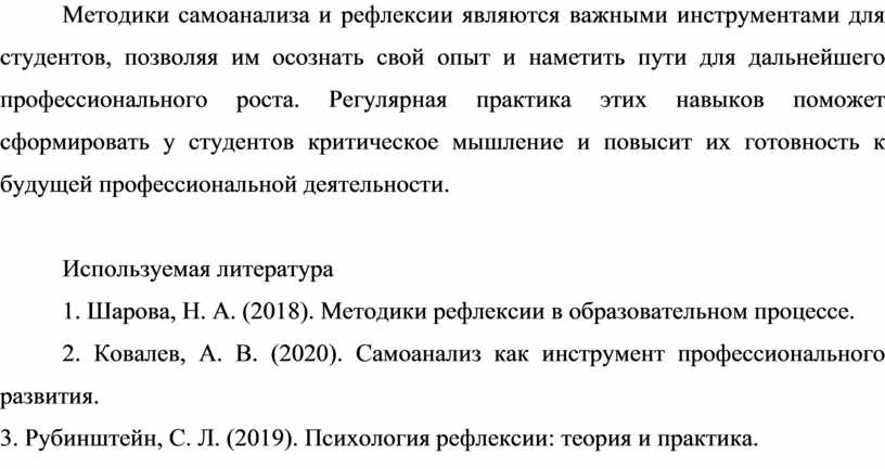 Методики самоанализа и рефлексии являются важными инструментами для студентов, позволяя им осознать свой опыт и наметить пути для дальнейшего профессионального роста. Регулярная практика этих навыков поможет сформировать у студентов критическое мышление и повысит их готовность к будущей профессиональной деятельности.