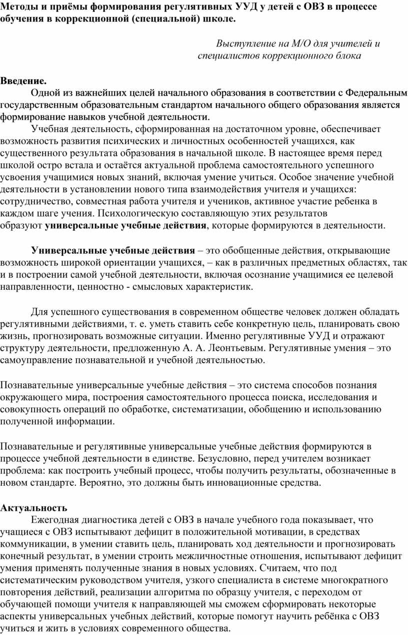 Методы и приёмы формирования регулятивных УУД у детей с ОВЗ в процессе обучения в коррекционной (специальной) школе.