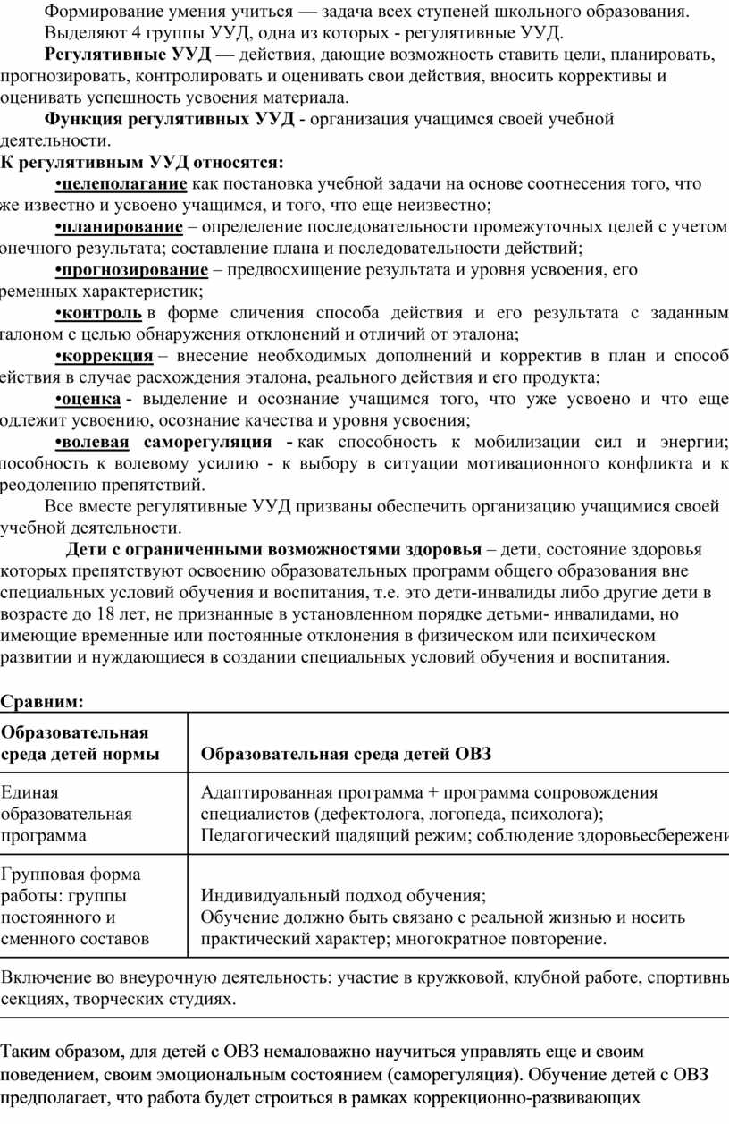 Таким образом, перед педагогами коррекционных школ встает необходимость формирования регулятивных УУД у детей с ОВЗ с целью выпуска учащегося из начальной школы более успешного, социализированного, самостоятельного, целеустремленного с учётом их психофизиологического развития.
