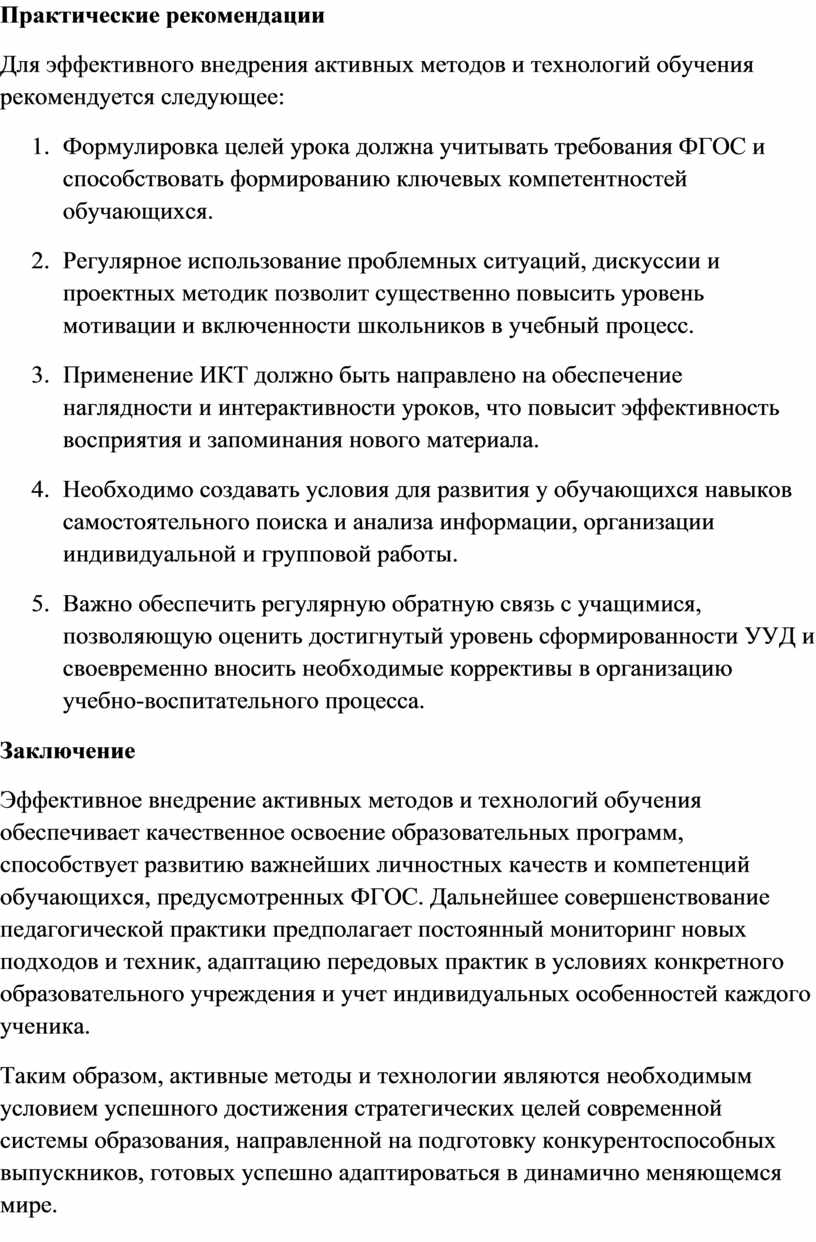 Таким образом, активные методы и технологии являются необходимым условием успешного достижения стратегических целей современной системы образования, направленной на подготовку конкурентоспособных выпускников, готовых успешно адаптироваться в динамично меняющемся мире.