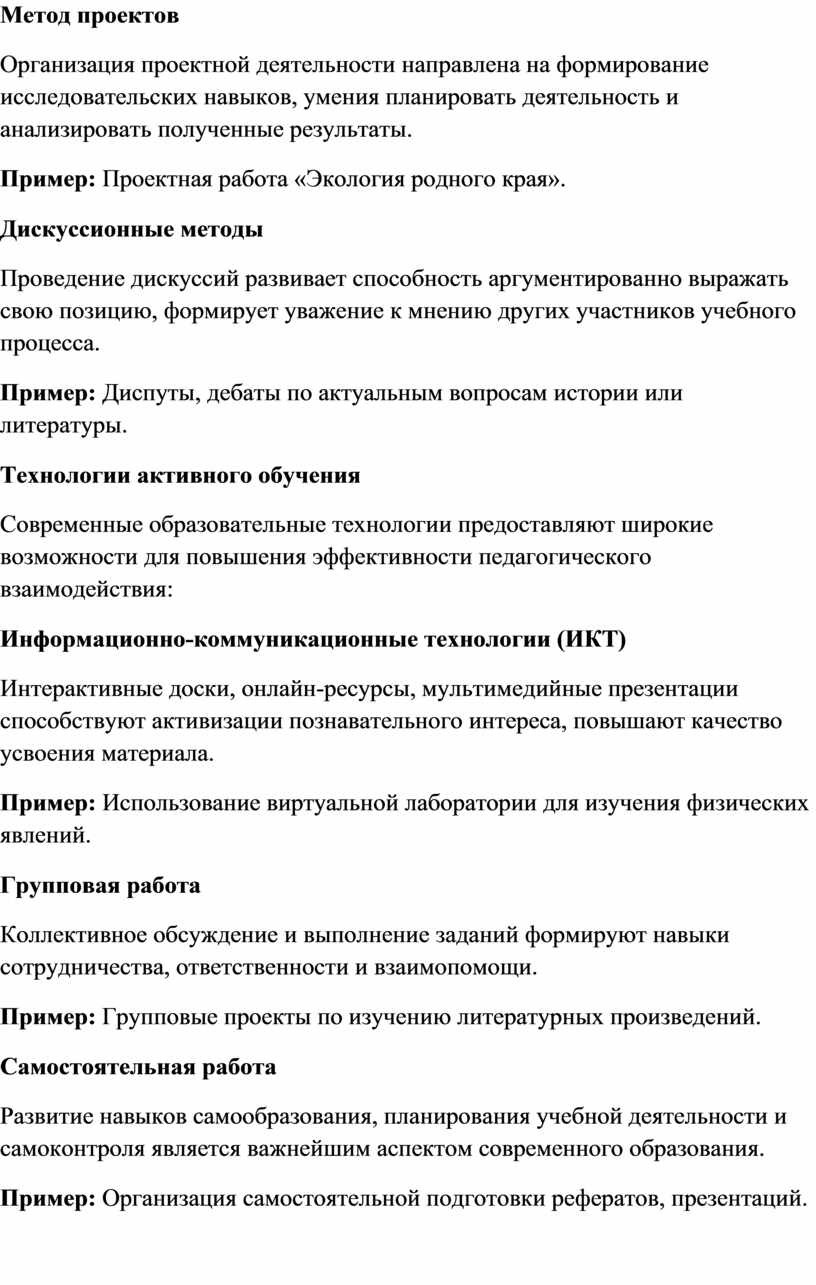 Эффективное внедрение активных методов и технологий обучения обеспечивает качественное освоение образовательных программ, способствует развитию важнейших личностных качеств и компетенций обучающихся, предусмотренных ФГОС. Дальнейшее совершенствование педагогической практики предполагает постоянный мониторинг новых подходов и техник, адаптацию передовых практик в условиях конкретного образовательного учреждения и учет индивидуальных особенностей каждого ученика.