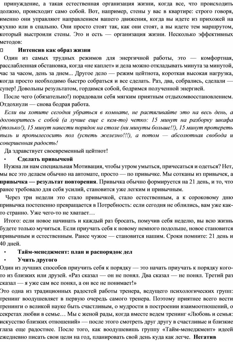 Хорошо, вы начали делать то, что вы хотели, — дальше нужно, чтобы работалось бодро и долго. Тут вам поможет организация жизни: это не кнут и не пряник, не подкуп и не принуждение, а такая естественная организация жизни, когда все, что происходить должно, происходит само собой. Вот, например, стены у вас в квартире: строго говоря, именно они управляют направлением вашего движения, когда вы идете из прихожей на кухню или в спальню. Они просто стоят так, как они стоят, а вы идете тем маршрутом, который выстроили стены. Это и есть — организация жизни. Несколько эффективных методов: