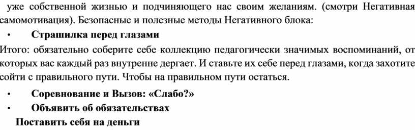 Негатив тоже прекрасно работает и когда-то бывает просто незаменим, просто он, бывает, увлекает, и тогда из удобного инструмента превращается в опасного монстра, живущего уже собственной жизнью и подчиняющего нас своим желаниям. (смотри Негативная самомотивация). Безопасные и полезные методы Негативного блока: