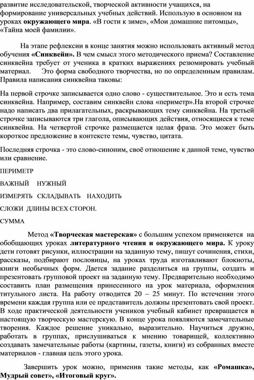 На этапе рефлексии в конце занятия можно использовать активный метод обучения «Синквейн». В чем смысл этого методического приема? Составление синквейна требует от ученика в кратких выражениях резюмировать учебный материал. Это форма свободного творчества, но по определенным правилам. Правила написания синквейна таковы: