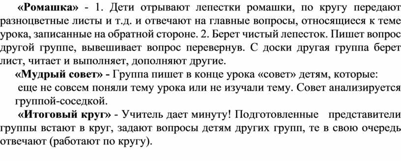 «Ромашка» - 1. Дети отрывают лепестки ромашки, по кругу передают разноцветные листы и т.д. и отвечают на главные вопросы, относящиеся к теме урока, записанные на обратной стороне. 2. Берет чистый лепесток. Пишет вопрос другой группе, вывешивает вопрос перевернув. С доски другая группа берет лист, читает и выполняет, дополняют другие.