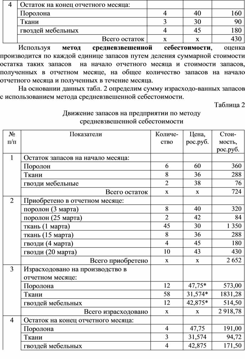 Используя метод средневзвешенной себестоимости, оценка производится по каждой единице запасов путем деления суммарной стоимости остатка таких запасов на начало отчетного месяца и стоимости запасов, полученных в отчетном месяце, на общее количество запасов на начало отчетного месяца и полученных в течение месяца.