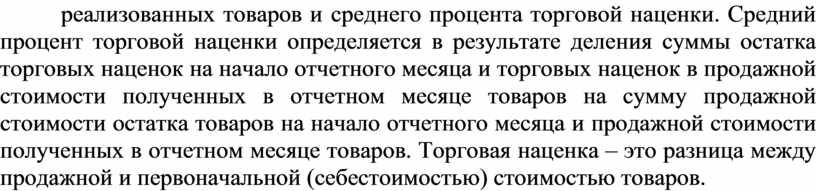 Оценка выбытия запасов по ценам продажи основана на применении предприятиями розничной торговли среднего процента торговой наценки на товар. Этот метод следует применять предприятиям, которые имеют значительную и изменяющуюся номенклатуру товаров с приблизительно одинаковым уровнем торговой наценки. Себестоимость реализованных товаров определяется как разница между продажной стоимостью реализованных товаров и суммой торговой наценки на эти товары. Сумма торговой наценки на реализованные товары определяется как произведение продажной стоимости реализованных товаров и среднего процента торговой наценки. Средний процент торговой наценки определяется в результате деления суммы остатка торговых наценок на начало отчетного месяца и торговых наценок в продажной стоимости полученных в отчетном месяце товаров на сумму продажной стоимости остатка товаров на начало отчетного месяца и продажной стоимости полученных в отчетном месяце товаров. Торговая наценка – это разница между продажной и первоначальной (себестоимостью) стоимостью товаров.