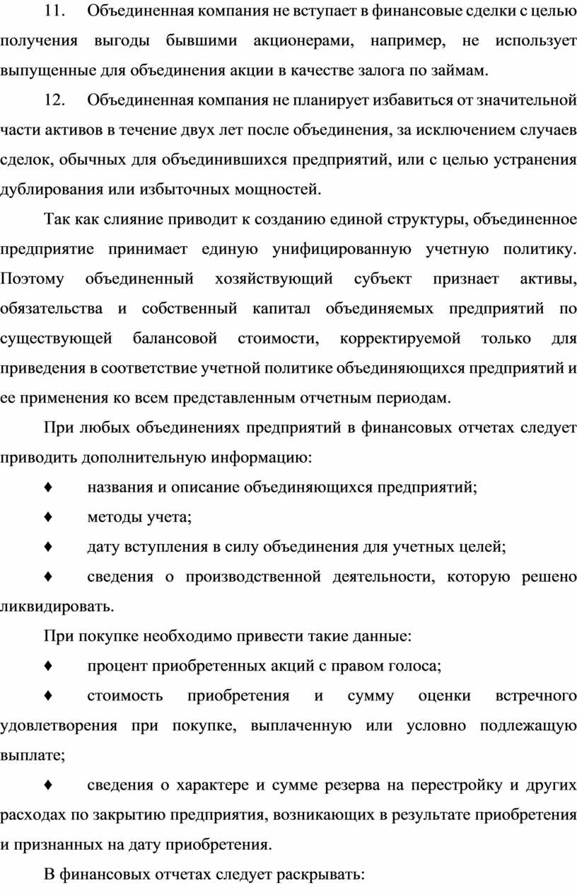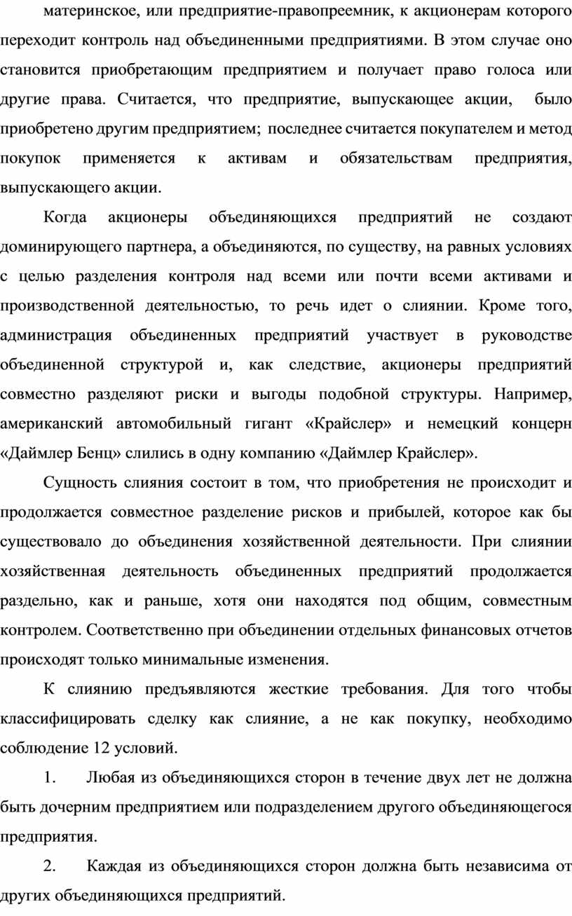 К слиянию предъявляются жесткие требования. Для того чтобы классифицировать сделку как слияние, а не как покупку, необходимо соблюдение 12 условий.
