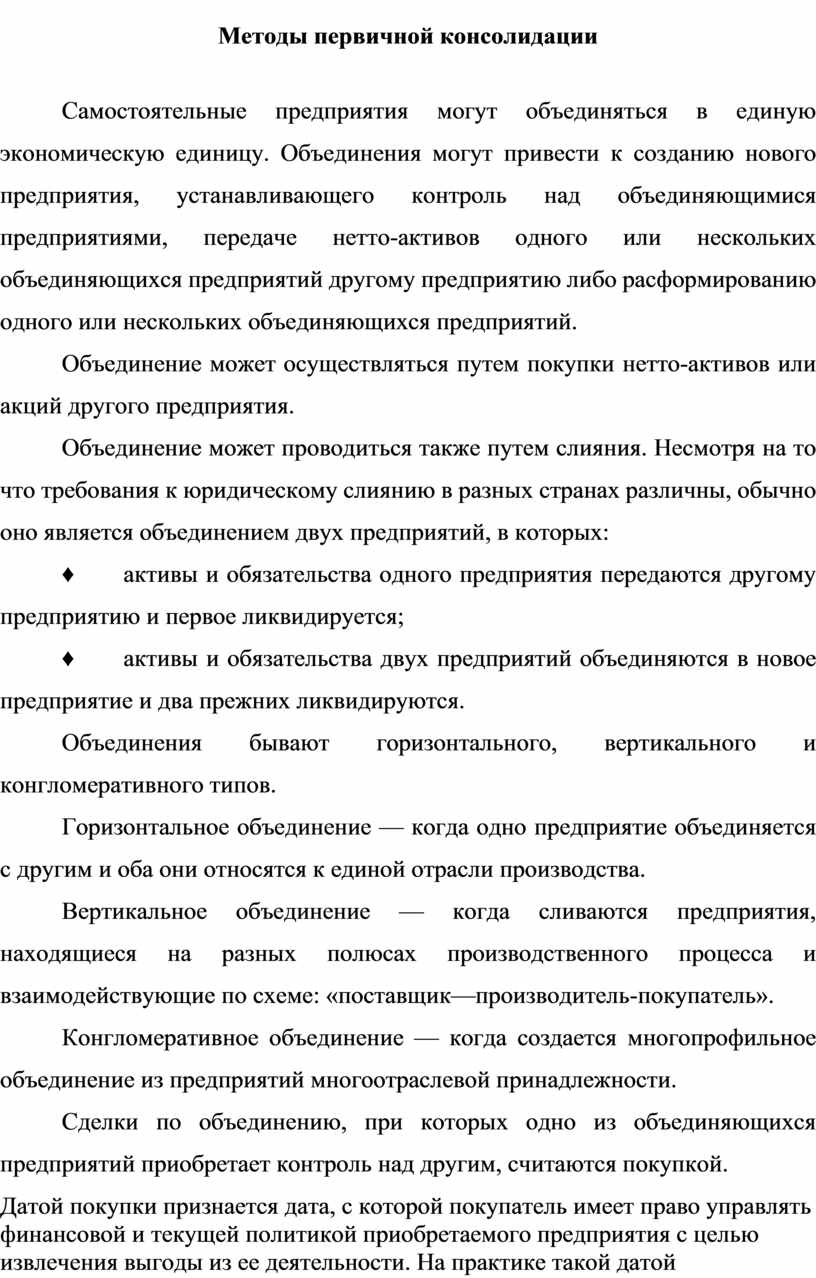 Объединение может осуществляться путем покупки нетто-активов или акций другого предприятия.