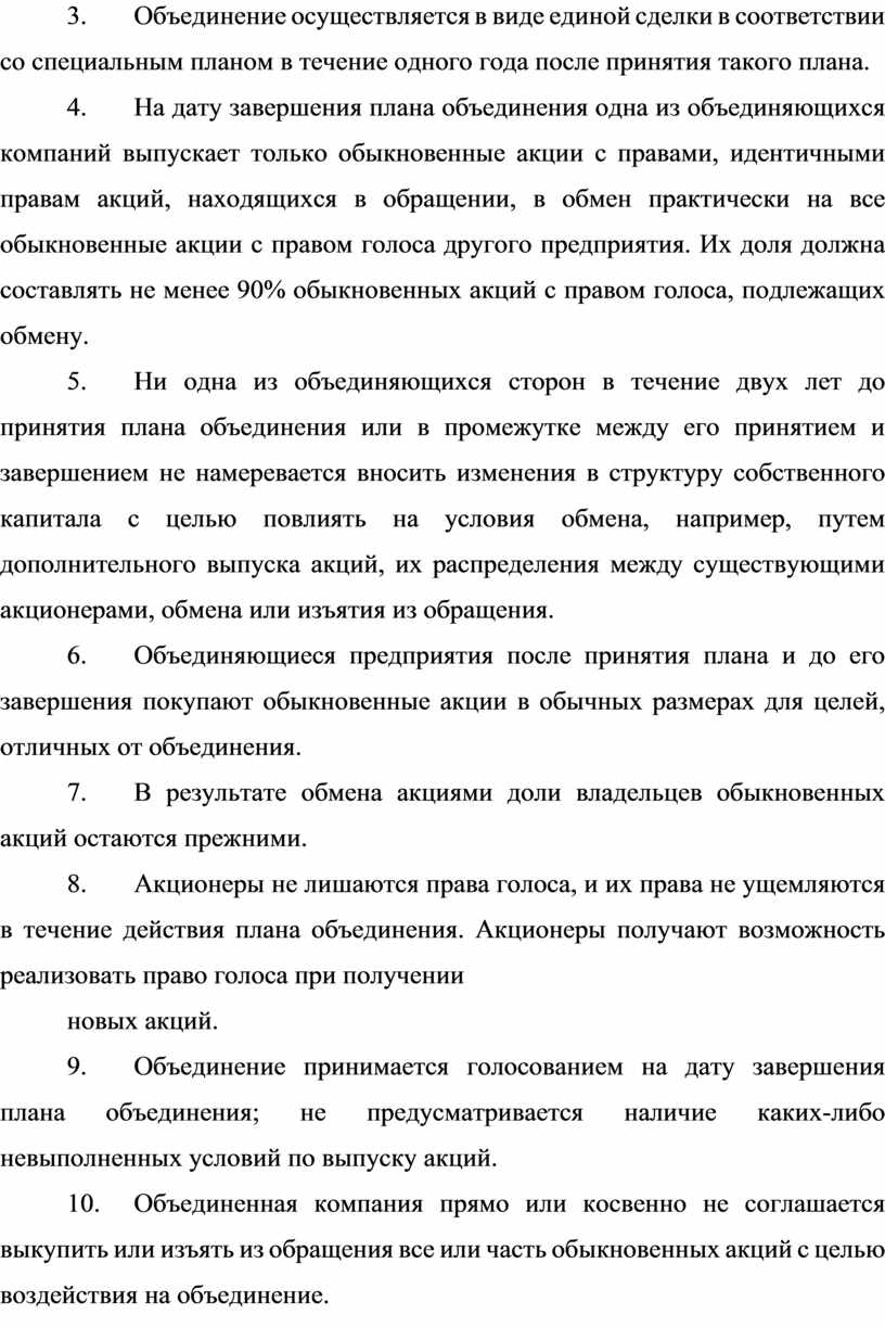 4. На дату завершения плана объединения одна из объединяющихся компаний выпускает только обыкновенные акции с правами, идентичными правам акций, находящихся в обращении, в обмен практически на все обыкновенные акции с правом голоса другого предприятия. Их доля должна составлять не менее 90% обыкновенных акций с правом голоса, подлежащих обмену.