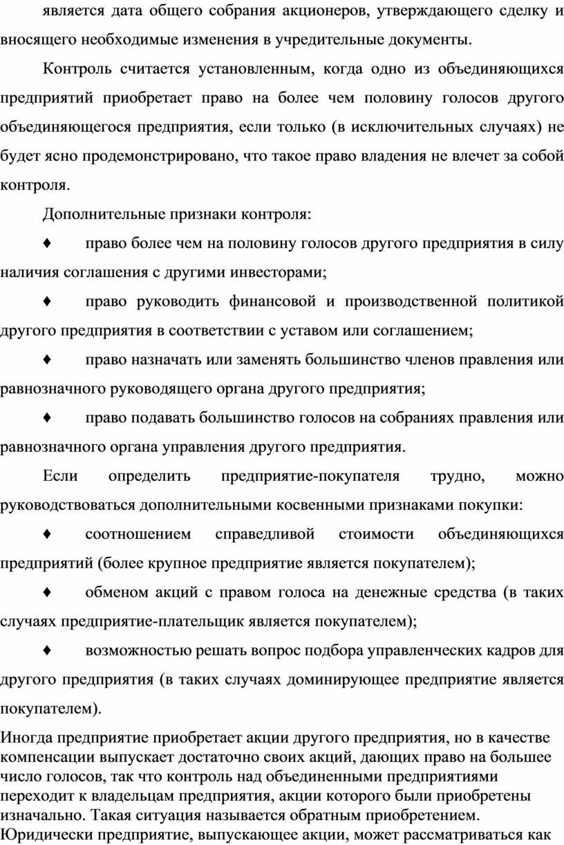 6. Объединяющиеся предприятия после принятия плана и до его завершения покупают обыкновенные акции в обычных размерах для целей, отличных от объединения.