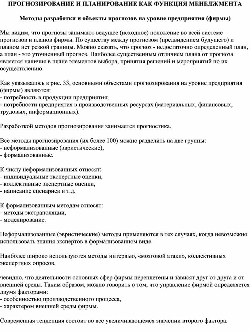 Методы разработки и объекты прогнозов на уровне предприятия (фирмы)