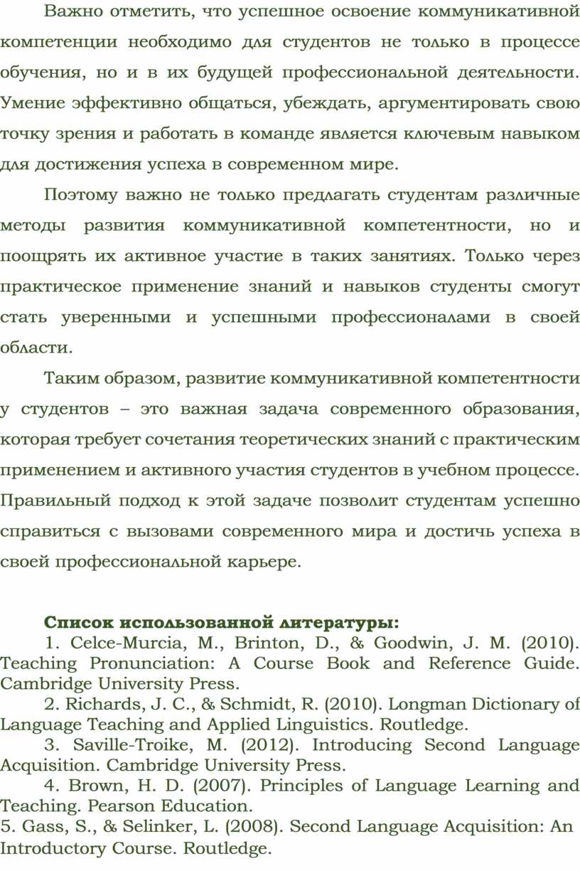Важно отметить, что успешное освоение коммуникативной компетенции необходимо для студентов не только в процессе обучения, но и в их будущей профессиональной деятельности. Умение эффективно общаться, убеждать, аргументировать свою точку зрения и работать в команде является ключевым навыком для достижения успеха в современном мире.