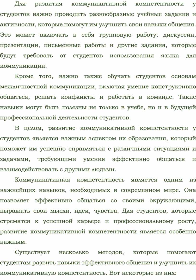 В целом, развитие коммуникативной компетентности у студентов является важным аспектом их образования, который поможет им успешно справляться с различными ситуациями и задачами, требующими умения эффективно общаться и взаимодействовать с другими людьми.
