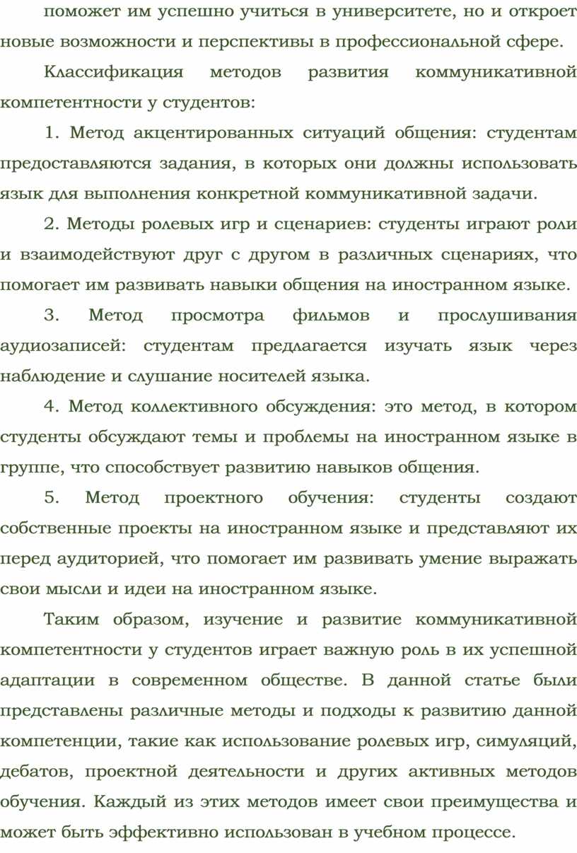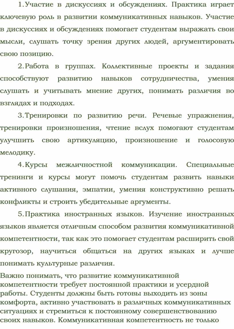 Поэтому важно не только предлагать студентам различные методы развития коммуникативной компетентности, но и поощрять их активное участие в таких занятиях. Только через практическое применение знаний и навыков студенты смогут стать уверенными и успешными профессионалами в своей области.