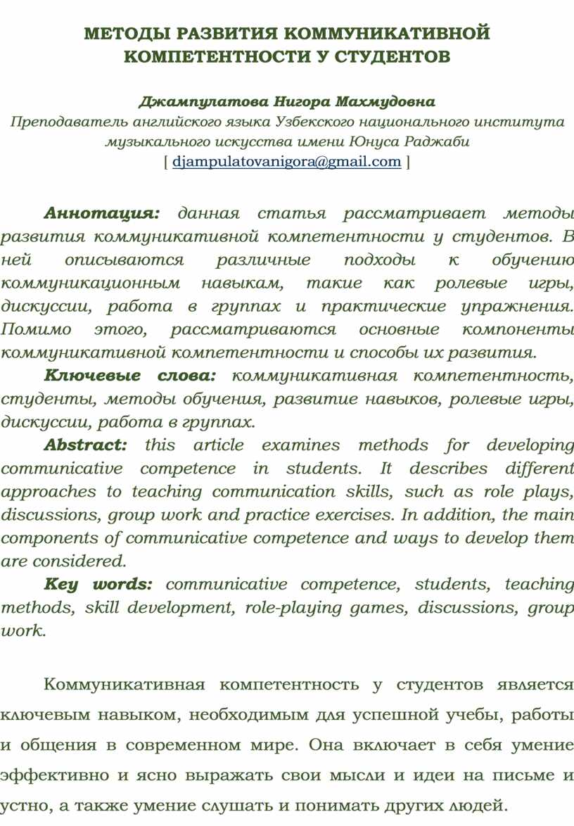 Аннотация: данная статья рассматривает методы развития коммуникативной компетентности у студентов. В ней описываются различные подходы к обучению коммуникационным навыкам, такие как ролевые игры, дискуссии, работа в группах и практические упражнения. Помимо этого, рассматриваются основные компоненты коммуникативной компетентности и способы их развития.