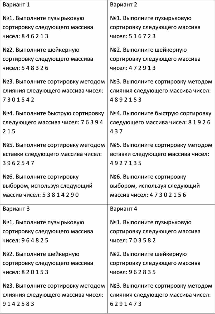 Вариант 4 №1. Выполните пузырьковую сортировку следующего массива чисел: 7 0 3 5 8 2 №2. Выполните шейкерную сортировку следующего массива чисел: 9 6 2 8 3 5 №3. Выполните сортировку методом слияния следующего массива чисел: 6 2 9 1 4 7 3 №4. Выполните быструю сортировку следующего массива чисел: 8 3 2 5 7 1 4 6 №5. Выполните сортировку методом вставки следующего массива чисел: 2 1 9 4 3 2 6 №6. Выполните сортировку выбором, используя следующий массив чисел: 4 9 3 2 7 1 6 5 |