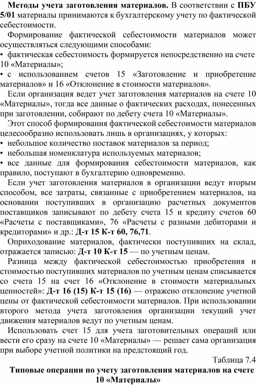 Методы учета заготовления материалов. В соответствии с ПБУ 5/01 материалы принимаются к бухгалтерскому учету по фактической себестоимости.