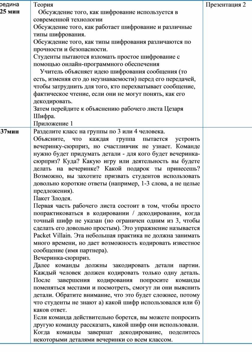 Теория Обсуждение того, как шифрование используется в современной технологии Обсуждение того, как работает шифрование и различные типы шифрования. Обсуждение того, как типы шифрования различаются по прочности и безопасности. Студенты пытаются взломать простое шифрование с помощью онлайн-программного обеспечения Учитель объясняет идею шифрования сообщения (то есть, изменяя его до неузнаваемости) перед его передачей, чтобы затруднить для того, кто перехватывает сообщение, фактическое чтение, если они не могут понять, как его декодировать. Затем перейдите к объяснению рабочего листа Цезаря Шифра. Приложение 1 |