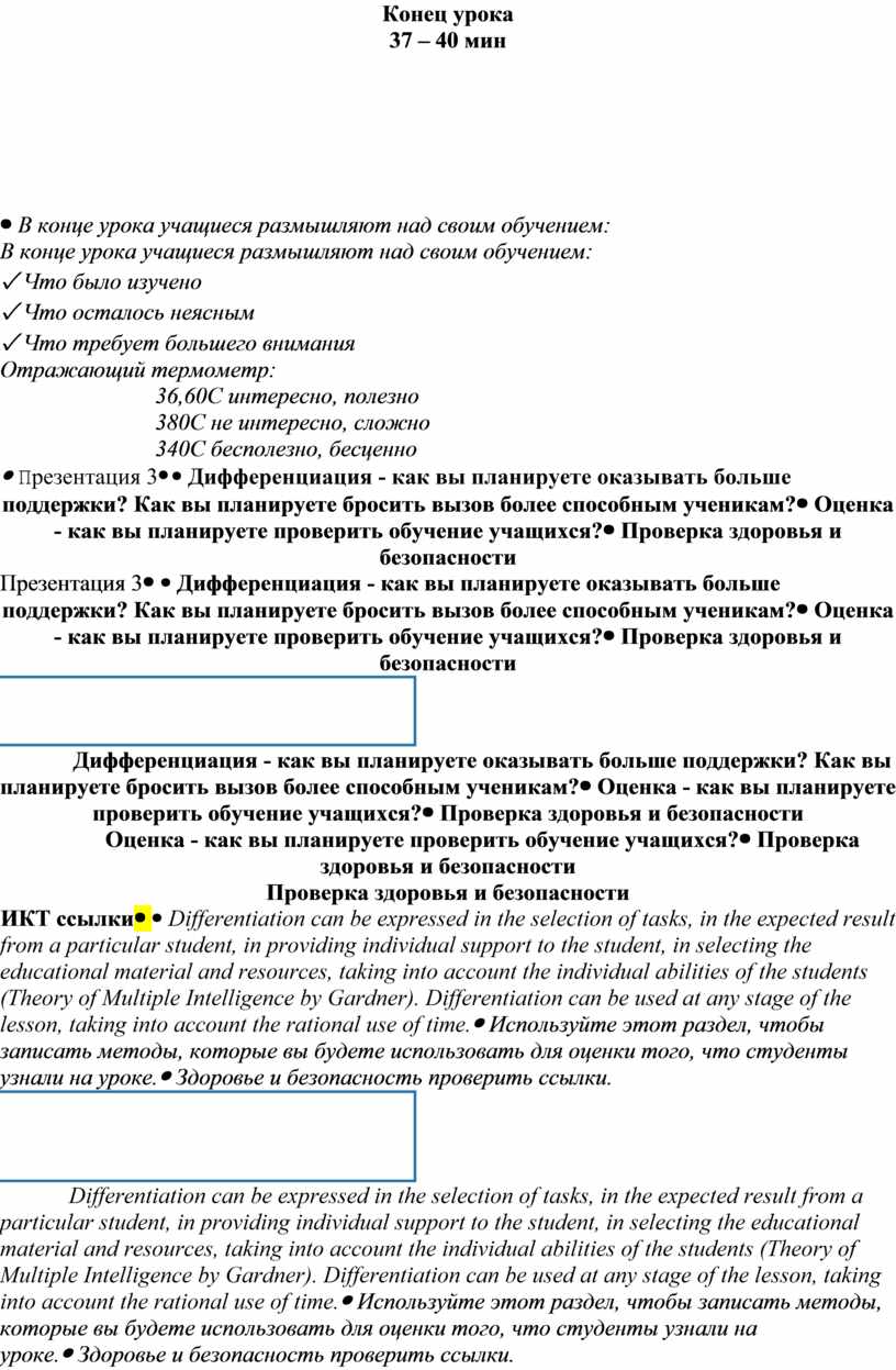 В конце урока учащиеся размышляют над своим обучением: ✓ Что было изучено ✓ Что осталось неясным ✓ Что требует большего внимания Отражающий термометр: 36,60С интересно, полезно 380С не интересно, сложно 340С бесполезно, бесценно |