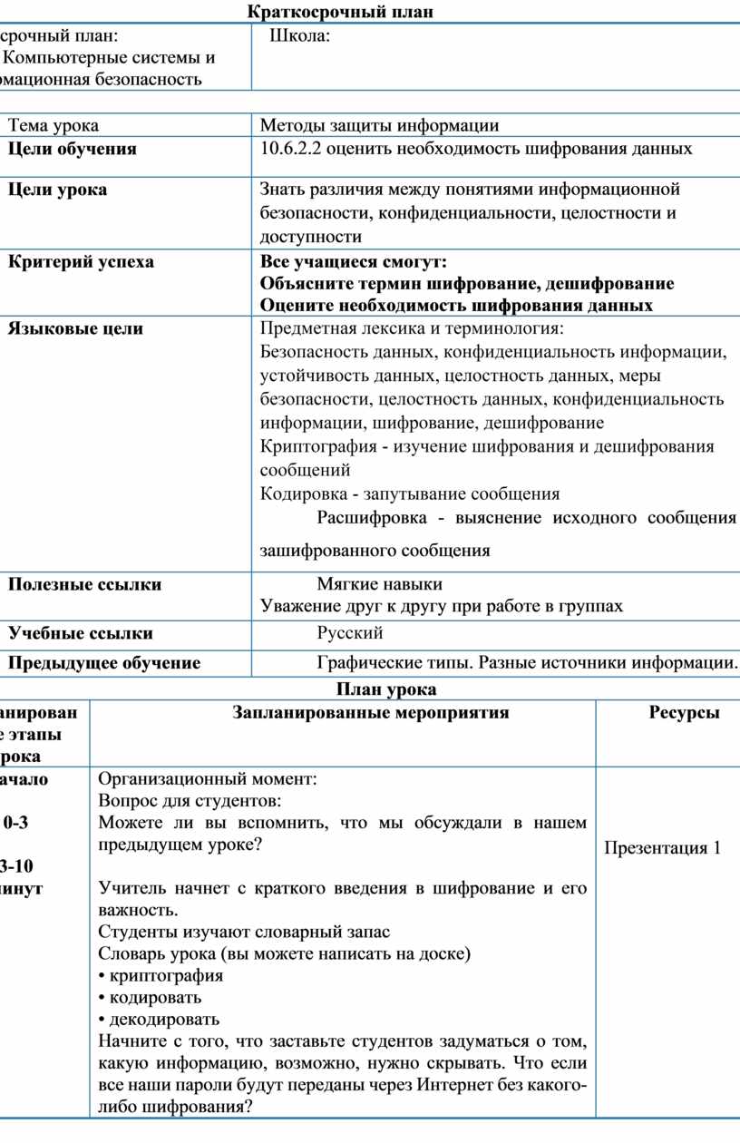 Долгосрочный план: 10.1А Компьютерные системы и информационная безопасность |