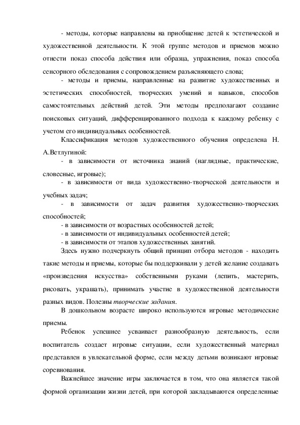 Вот например, первая группа задач направлена на приобщение детей к искусству, на развитие у дошкольников эстетического вкуса, понимание прекрасного. Ведущими методами для решения этих задач являются показ, анализ, объяснение , наблюдение, пример взрослого.