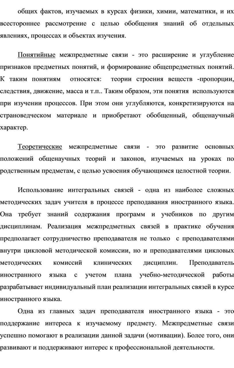 Использование интегральных связей - одна из наиболее сложных методических задач учителя в процессе преподавания иностранного языка. Она требует знаний содержания программ и учебников по другим дисциплинам. Реализация межпредметных связей в практике обучения предполагает сотрудничество преподавателя не только с преподавателями внутри цикловой методической комиссии, но и преподавателями цикловых методических комиссий клинических дисциплин. Преподаватель иностранного языка с учетом плана учебно-методической работы разрабатывает индивидуальный план реализации интегральных связей в курсе иностранного языка.