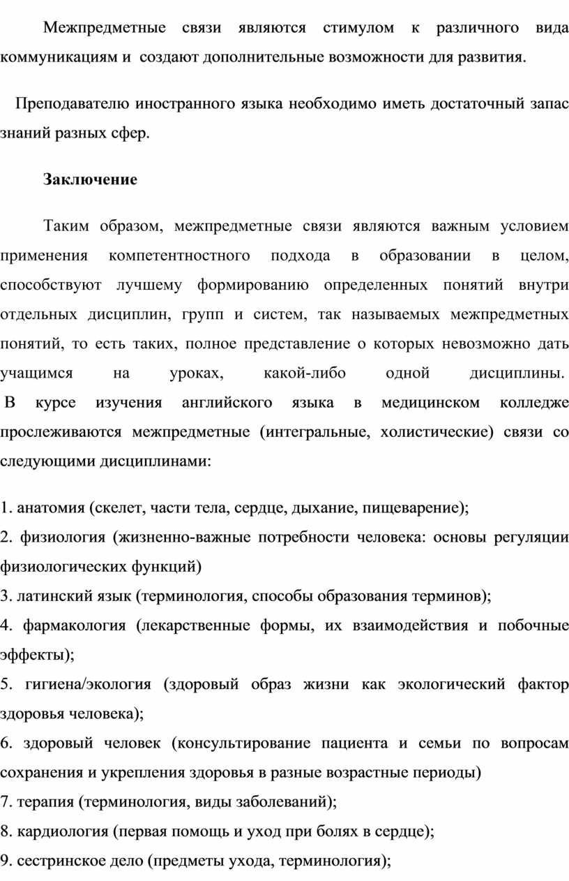 Межпредметные связи на занятиях английского в медицинском колледже направлены на формирование многогранного специалиста, способного эффективно применять языковые и профессиональные знания в условиях глобализации и цифровизации медицины.