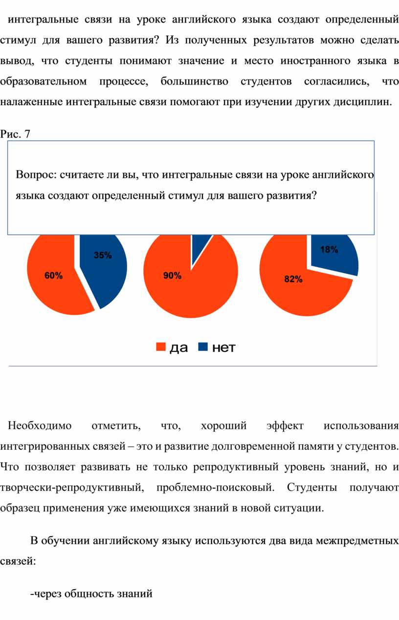 Необходимо отметить, что, хороший эффект использования интегрированных связей – это и развитие долговременной памяти у студентов. Что позволяет развивать не только репродуктивный уровень знаний, но и творчески-репродуктивный, проблемно-поисковый. Студенты получают образец применения уже имеющихся знаний в новой ситуации.