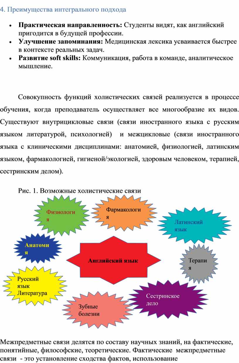 Совокупность функций холистических связей реализуется в процессе обучения, когда преподаватель осуществляет все многообразие их видов. Существуют внутрицикловые связи (связи иностранного языка с русским языком литературой, психологией) и межцикловые (связи иностранного языка с клиническими дисциплинами: анатомией, физиологией, латинским языком, фармакологией, гигиеной/экологией, здоровым человеком, терапией, сестринским делом).