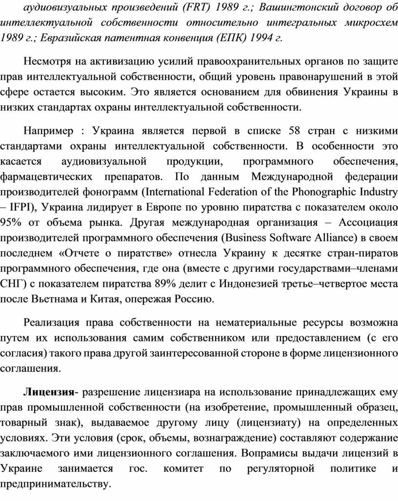 Например : Украина является первой в списке 58 стран с низкими стандартами охраны интеллектуальной собственности. В особенности это касается аудиовизуальной продукции, программного обеспечения, фармацевтических препаратов. По данным Международной федерации производителей фонограмм (International Federation of the Phonographic Industry – IFPI), Украина лидирует в Европе по уровню пиратства с показателем около 95% от объема рынка. Другая международная организация – Ассоциация производителей программного обеспечения (Business Software Alliance) в своем последнем «Отчете о пиратстве» отнесла Украину к десятке стран-пиратов программного обеспечения, где она (вместе с другими государствами–членами СНГ) с показателем пиратства 89% делит с Индонезией третье–четвертое места после Вьетнама и Китая, опережая Россию.