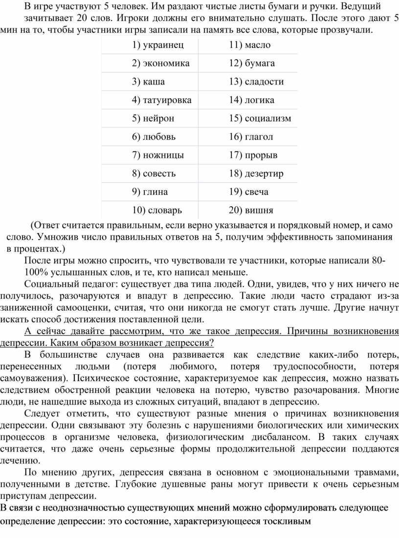 зачитывает 20 слов. Игроки должны его внимательно слушать. После этого дают 5 мин на то, чтобы участники игры записали на память все слова, которые прозвучали.