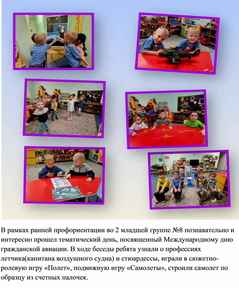 В рамках ранней профориентации во 2 младшей группе №8 познавательно и интересно прошел тематический день, посвященный Международному дню гражданской авиации. В ходе беседы ребята узнали о профессиях летчика(капитана воздушного судна) и стюардессы, играли в сюжетно-ролевую игру «Полет», подвижную игру «Самолеты», строили самолет по образцу из счетных палочек.