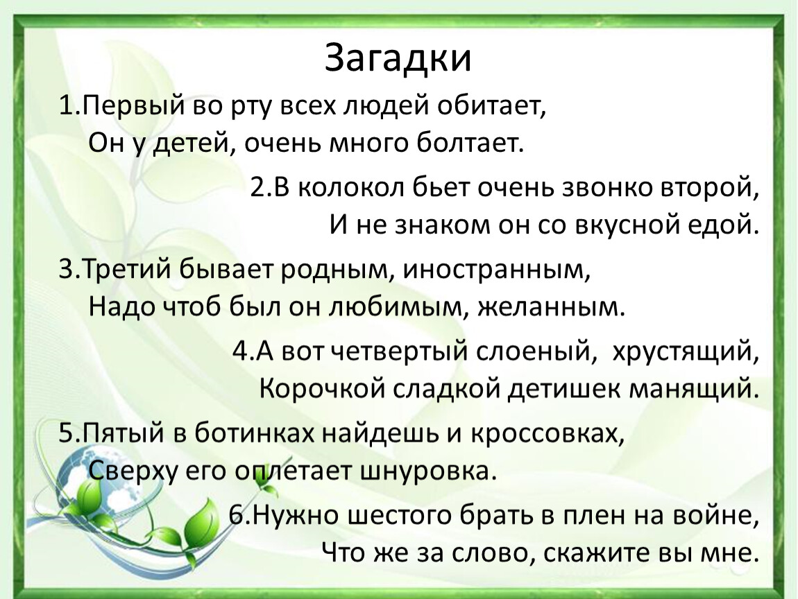 1.Первый во рту всех людей обитает, Он у детей, очень много болтает.