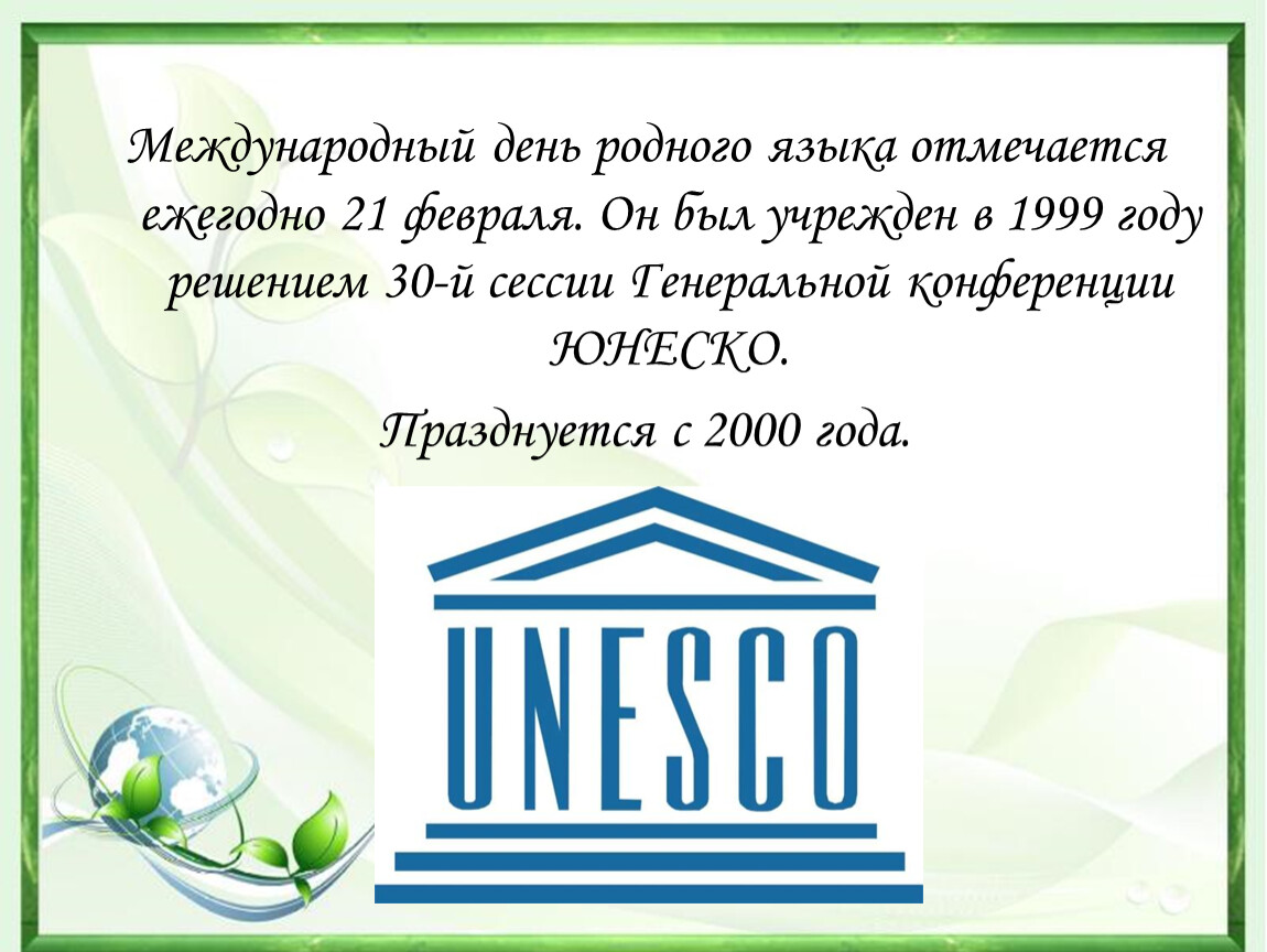 Международный день родного языка отмечается ежегодно 21 февраля. Он был учрежден в 1999 году решением 30-й сессии Генеральной конференции ЮНЕСКО.