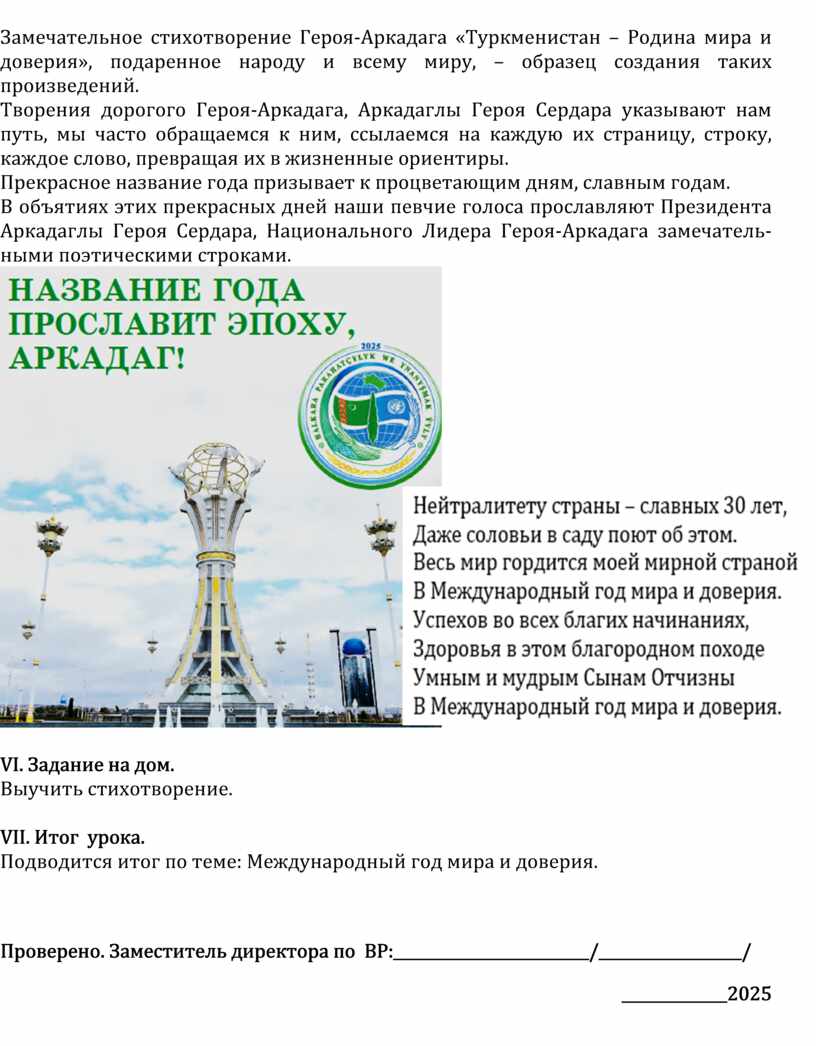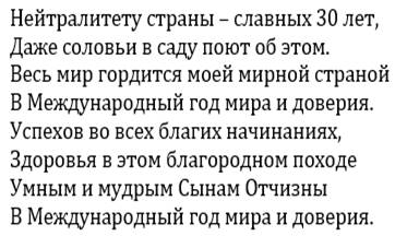 Замечательное стихотворение Героя-Аркадага «Туркменистан – Родина мира и доверия», подаренное народу и всему миру, – образец создания таких произведений.