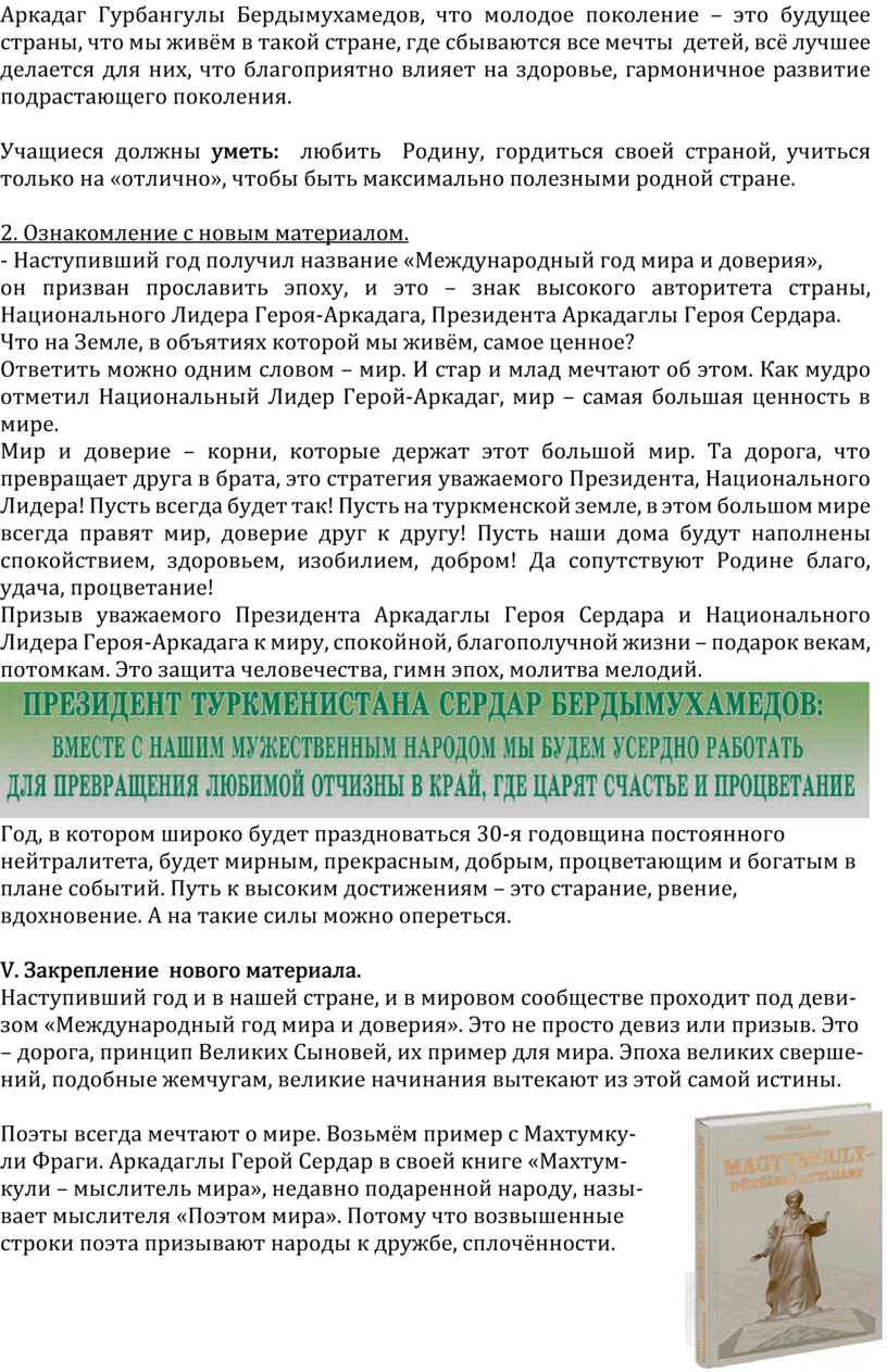 Учащиеся должны знать: что за всеми славными событиями, преобразованиями в нашей стране стоят уважаемый Президент Сердар Бердымухамедов и Герой-Аркадаг Гурбангулы Бердымухамедов, что молодое поколение – это будущее страны, что мы живём в такой стране, где сбываются все мечты детей, всё лучшее делается для них, что благоприятно влияет на здоровье, гармоничное развитие подрастающего поколения.