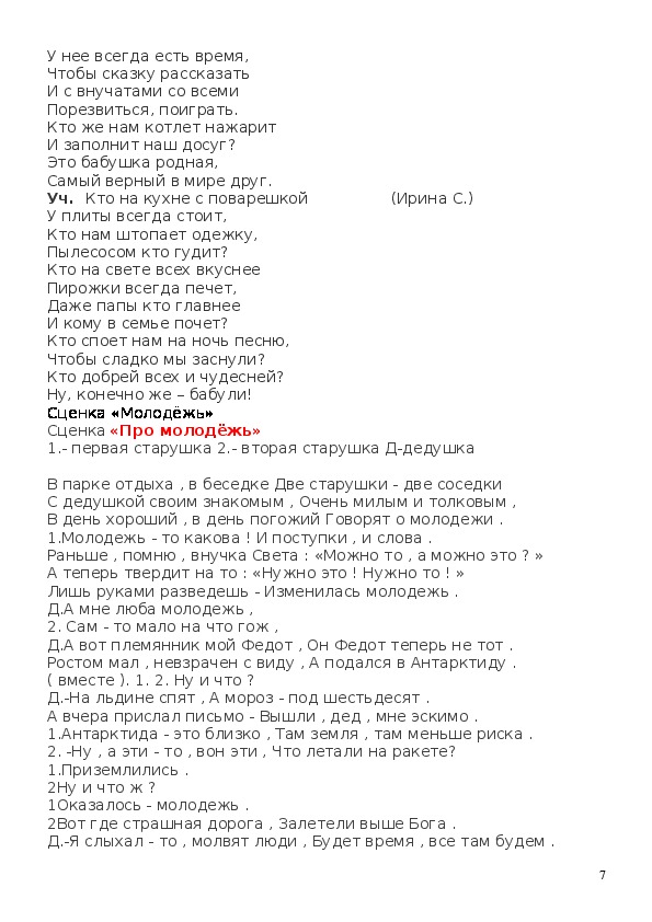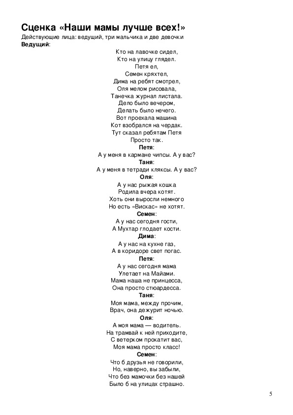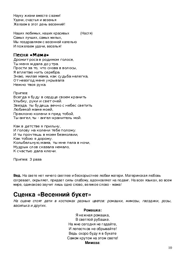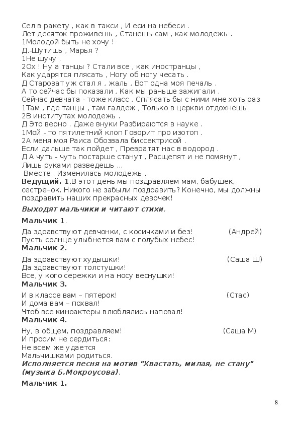 Внеклассное мероприятие очень интересное по своему содержанию. В него включены и поздравительные стихотворения для мам, бабушек, учителей, а также интересные и смешные сценки, очень трогательные песни.
