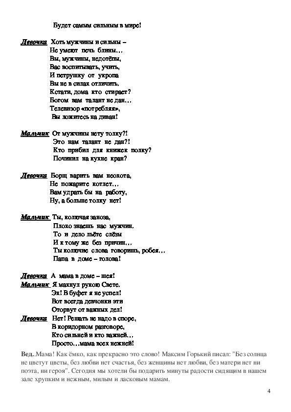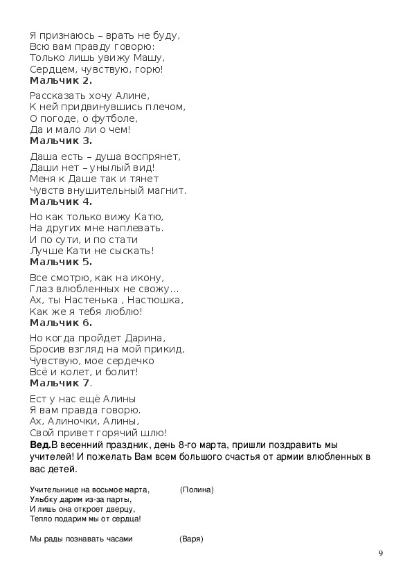 Ведущий: Дорогие мамочки, бабушки, девочки, учителя! Мы сегодня собрались в этом