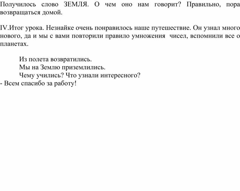 IV.Итог урока. Незнайке очень понравилось наше путешествие. Он узнал много нового, да и мы с вами повторили правило умножения чисел, вспомнили все о планетах.