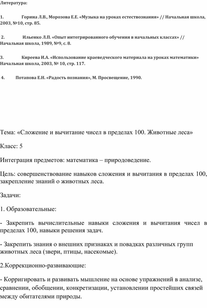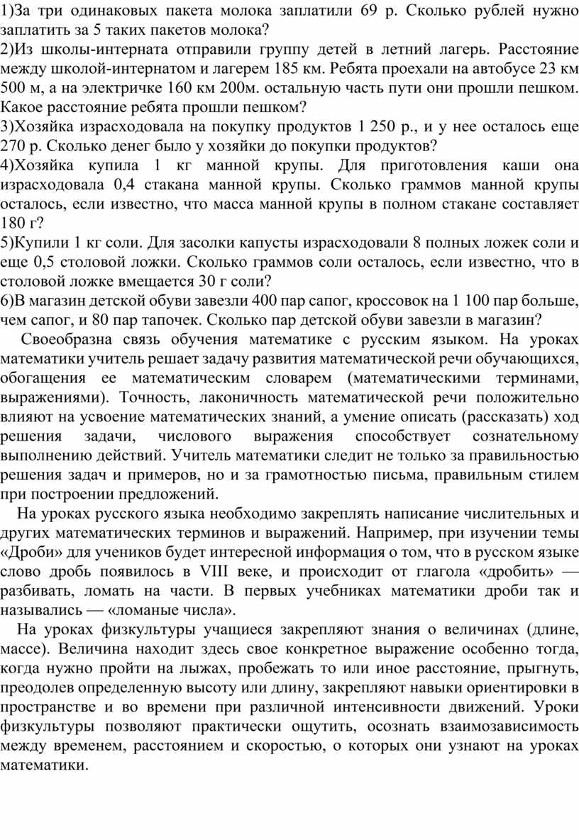 Практика работы показывает, что реализация при обучении математике общеобразовательной, коррекционно-развивающей и воспитательной задач, возможна лишь при осуществлении тесной связи преподавания математики с другими учебными предметами и окружающим миром.